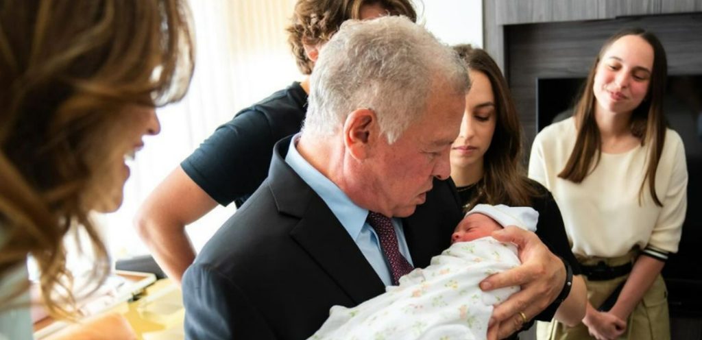 الملك عبدالله يحمل حفيدته الأولى الأميرة إيمان يوم ولادتها. من صفحة الأمير الحسين الرسميّة على “Instagram”.