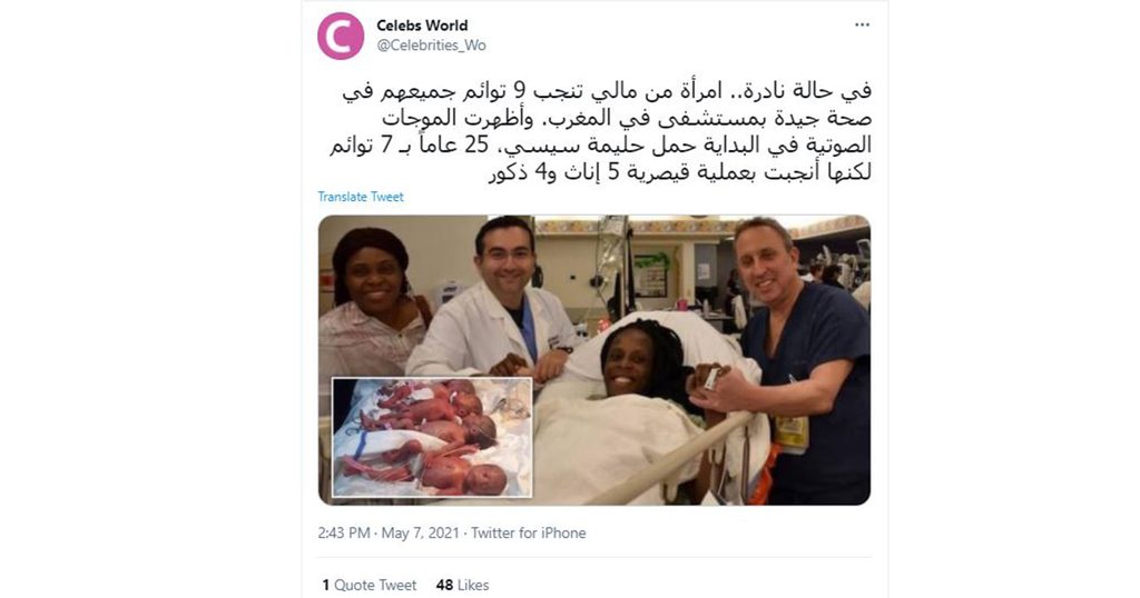 أنجبت امرأة من مالي 9 توائم في المغرب عام 2021 وقالت الحكومة إن الأطفال التسعة “بخير”، وقد نقلت حكومة مالي حليمة إلى المغرب للحصول على رعاية أفضل في. وكان يُعتقد في البداية أنها كانت تحمل سبعة توائم واعلنت وزارة الصحة في مالي في بيان إن سيسي أنجبت خمس فتيات وأربعة أولاد في عملية قيصرية.