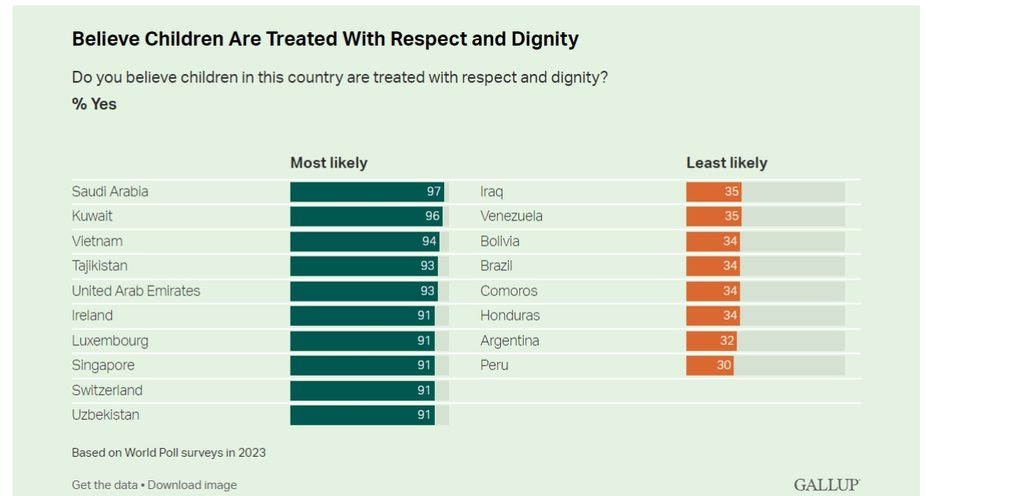 من جهة معاملة الأطفال باحترام وكرامة في بلادهم، حلّت ثلاثة من دول الخليج بين الدول الخمس الأولى. ففي عام 2023، أشار سكّان كل من المملكة العربيّة السعوديّة، الكويت والإمارات العربيّة المتّحدة الى أنّ أطفالهم يعاملون باحترام وكرامة.