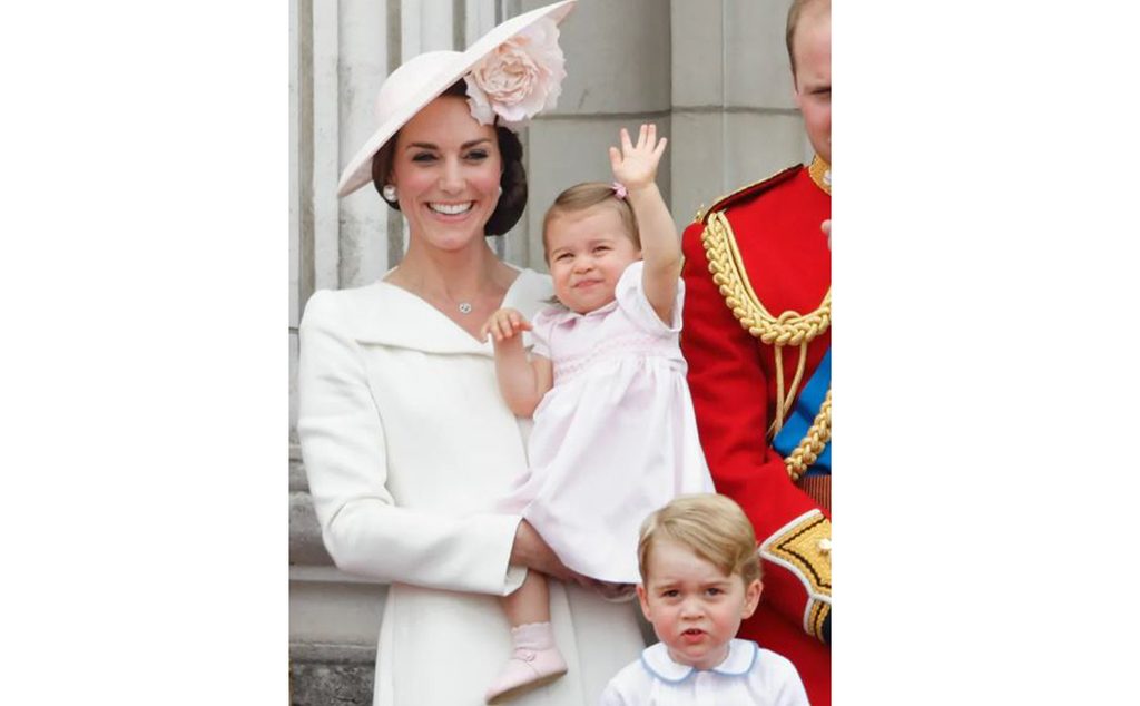 كيت ميدلتون والأميرة شارلوت خلال احتفالات عيد ميلاد الملكة إليزابيث الثانية التسعين في 11 يونيو 2016، تنسّقان اللون الأبيض مع الوردي الزاهي.