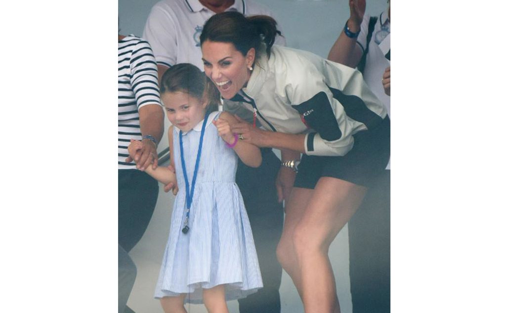 صورة عفوية لكيت ميدلتون والأميرة شارلوت خلال كأس الملك ريجيتا في 8 أغسطس 2019، ترتديان الملابس الرياضية التي تعكس أسلوب المناسبة.