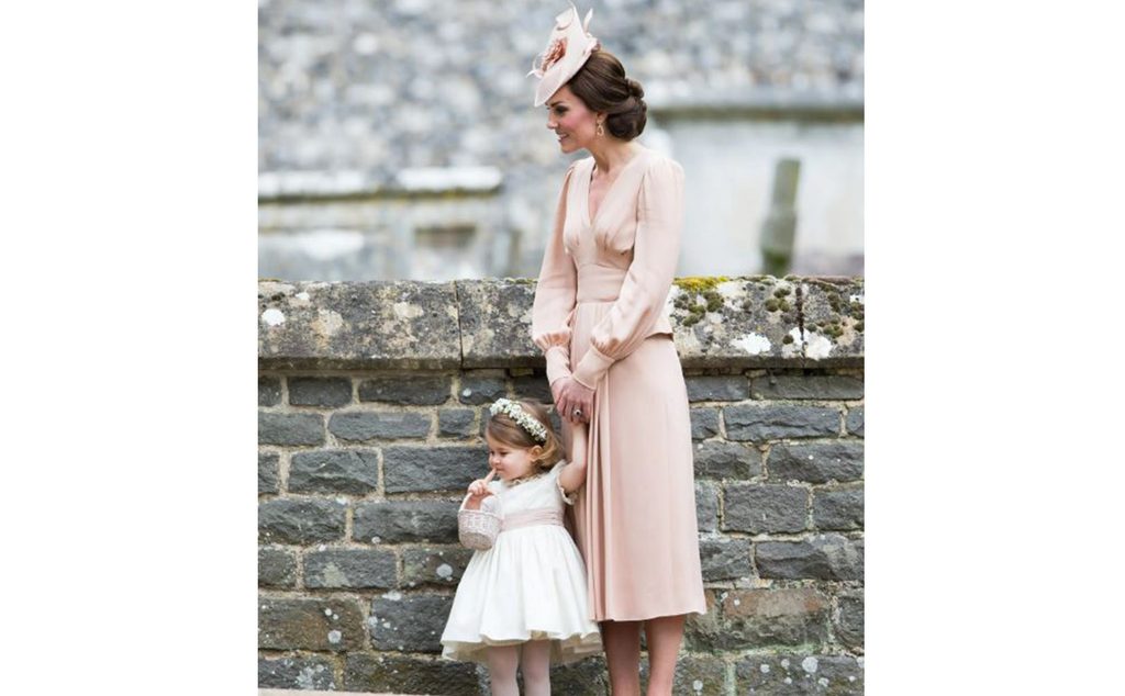 كيت ميدلتون والأميرة شارلوت خلال حفل زفاف بيبا ميدلتون وجيمس ماثيوز في 20 مايو 2017، تعتمدان إطلالة المناسبات السعيدة بأناقة لا مثيل لها، وتنسّقان الفساتين بالألوان الكريمية الفخمة.
