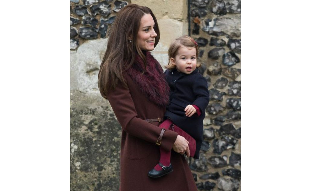 كيت ميدلتون والأميرة شارلوت في عيد الميلاد في باكليبري في 25 ديسمبر 2016، ترتديان المعاطف وتنسّقان اللون البرغندي بين معطف كيت وجوارب شارلوت.